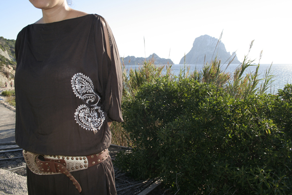 Cinturón elaborado con piel de vaca en Ibiza; la parte de atrás del cinturón está cortado y hace imitación de piel de serpiente. Original y magnífico cierre. Cadena de metal con detalles dorados.